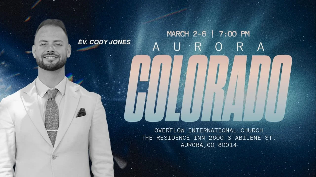 Ev. Cody Jones Revival! Free Event THIS IS A FREE EVENTJOIN US May 2nd-6th every night at 7pm. Residence Inn Conference RoomADDRESS IS: 2600 S Abilene St AURORA, COLORADO Register Today